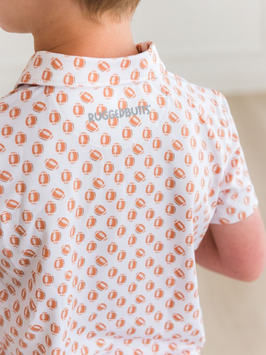 The 4-way stretch of this boys' performance polo ensures complete freedom of movement, making it ideal for sports and other high-energy activities. Its versatile design makes it a great partner for navy shorts or jeans, creating a smart yet casual ensemble. Plus, the Football Frenzy theme adds a fun, sporty twist to the wardrobe.